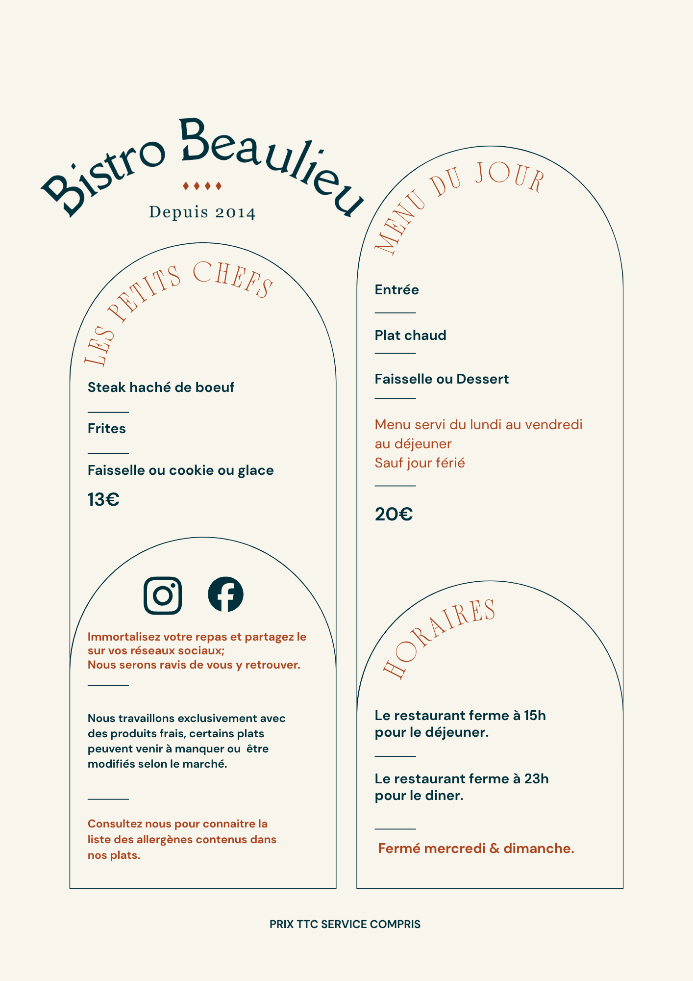 Le bistro Beaulieu est ouvert le Lundi, Mardi, Jeudi, Vendredi Midi et le Mardi, Vendredi, Samedi Soir.